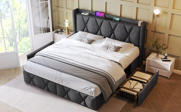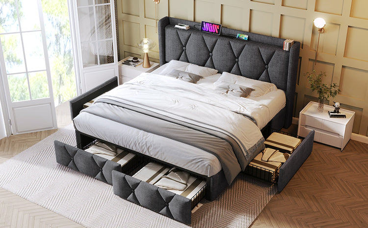 Product Name:Polsterbett mit aufladen USB Ladefunktion Kopfteil und 4 Schubladen,Doppelbett 160x200cm Stauraumbetten Bettgestell, Lattenrost aus Holz, Grau (Mit Matratze)