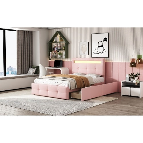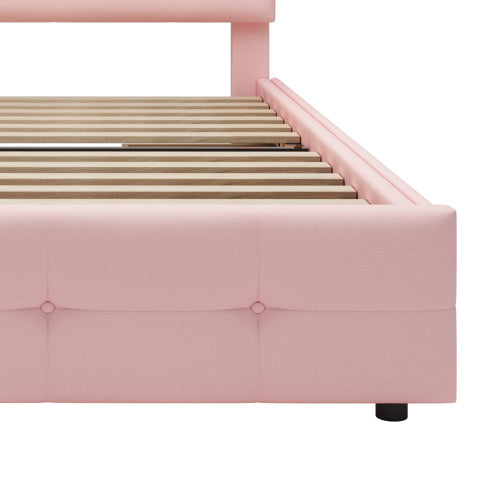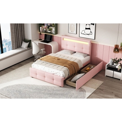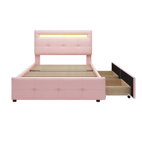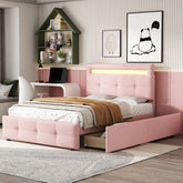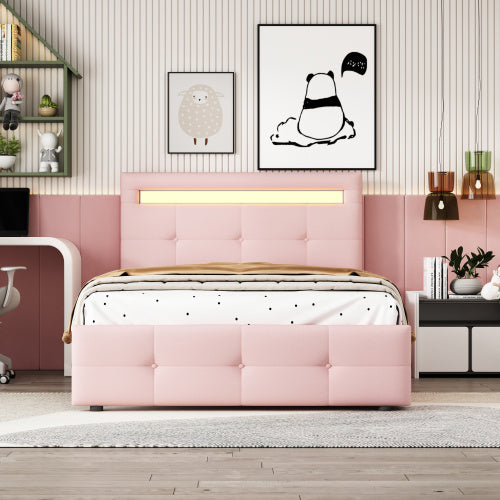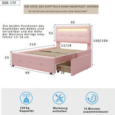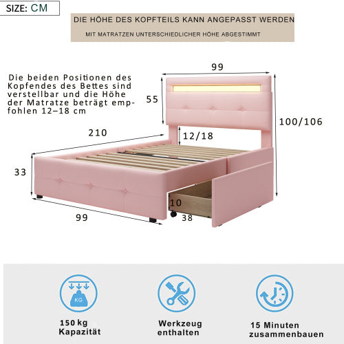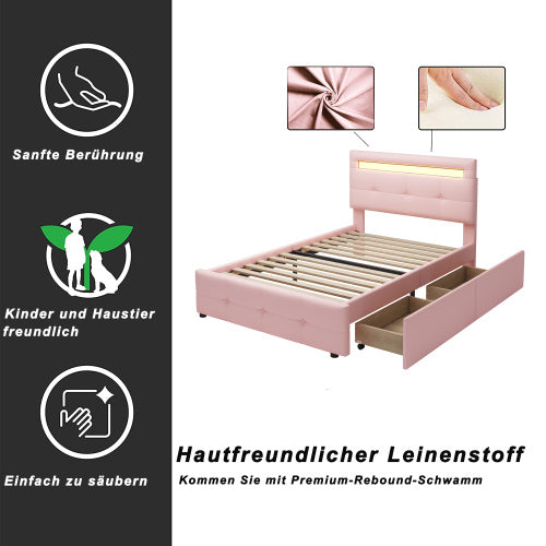 Product Name:Polsterbett 90*200cm mit LED-Leuchten, 2 Schubladen, hautfreundlicher Leinenpolsterung flach Einzelbett Kinderbett Jugendbett Gästebett (Rosa)