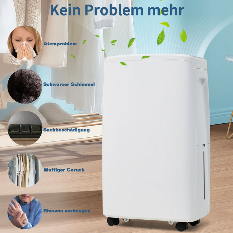 Die Rollen und Griffe dieses Luftentfeuchters sorgen für eine reibungslose Bewegung während des Gebrauchs. Benutzer können den Ablaufschlauch für eine kontinuierliche oder manuelle Entwässerung anschließen. Der Entfeuchter stoppt automatisch, wenn der 1,5 Liter-Wassertank voll ist. Der abnehmbare und waschbare Luftfilter ermöglicht eine einfache Reinigung und eine bequeme Wartung. Intelligente LED-Anzeige und Echtzeitüberwachung der Umgebungsfeuchtigkeit, Benutzer können den erforderlichen Entfeuchtungsmodus auswählen. Benutzer können mit diesem Luftentfeuchter überschüssige Feuchtigkeit aus dem Raum entfernen, um Ihre Atemwege zu schützen. Die Entfeuchtungsfunktion schützt Ihre Familienmitglieder vor Milben, insbesondere Säuglinge und Kleinkinder. Der schwarze Schimmel an Möbeln und Wänden riecht unangenehm und ist zudem voll von Verzinkung und es ist wichtig, die Luftfeuchtigkeit mit diesem Luftentfeuchter zu kontrollieren.