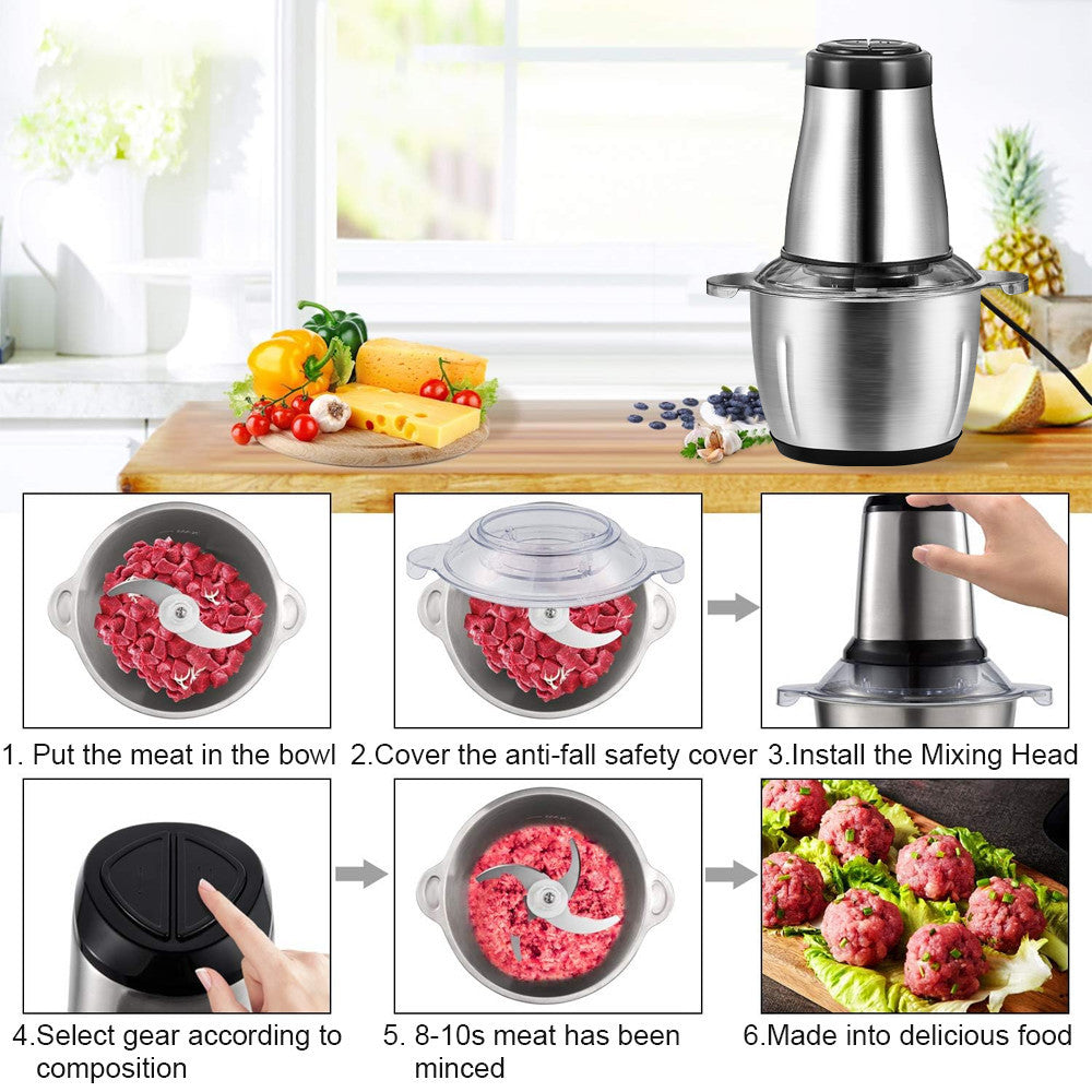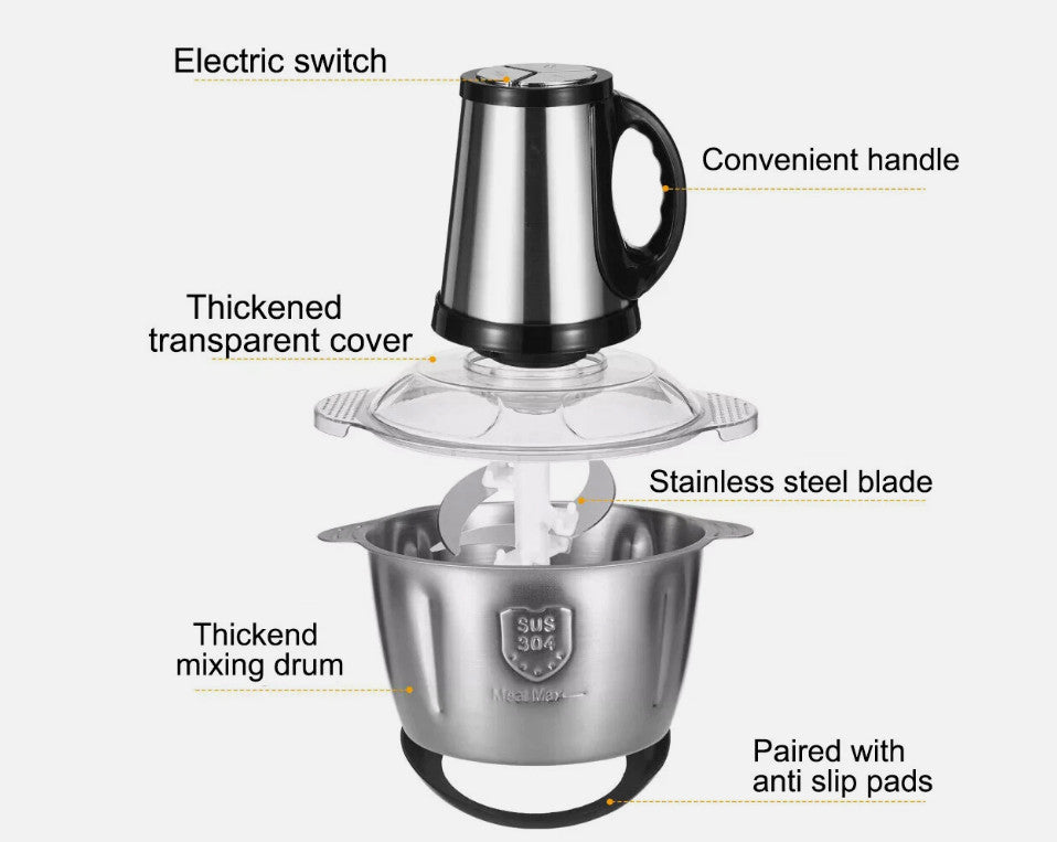 • 2L Stainless Steel Bowl – Equipped with a 2L capacity 304 stainless steel bowl, perfect for family meals or party cooking. The transparent lid allows you to monitor the chopping process, while the included non-slip pad keeps the chopper stable and your kitchen tidy.